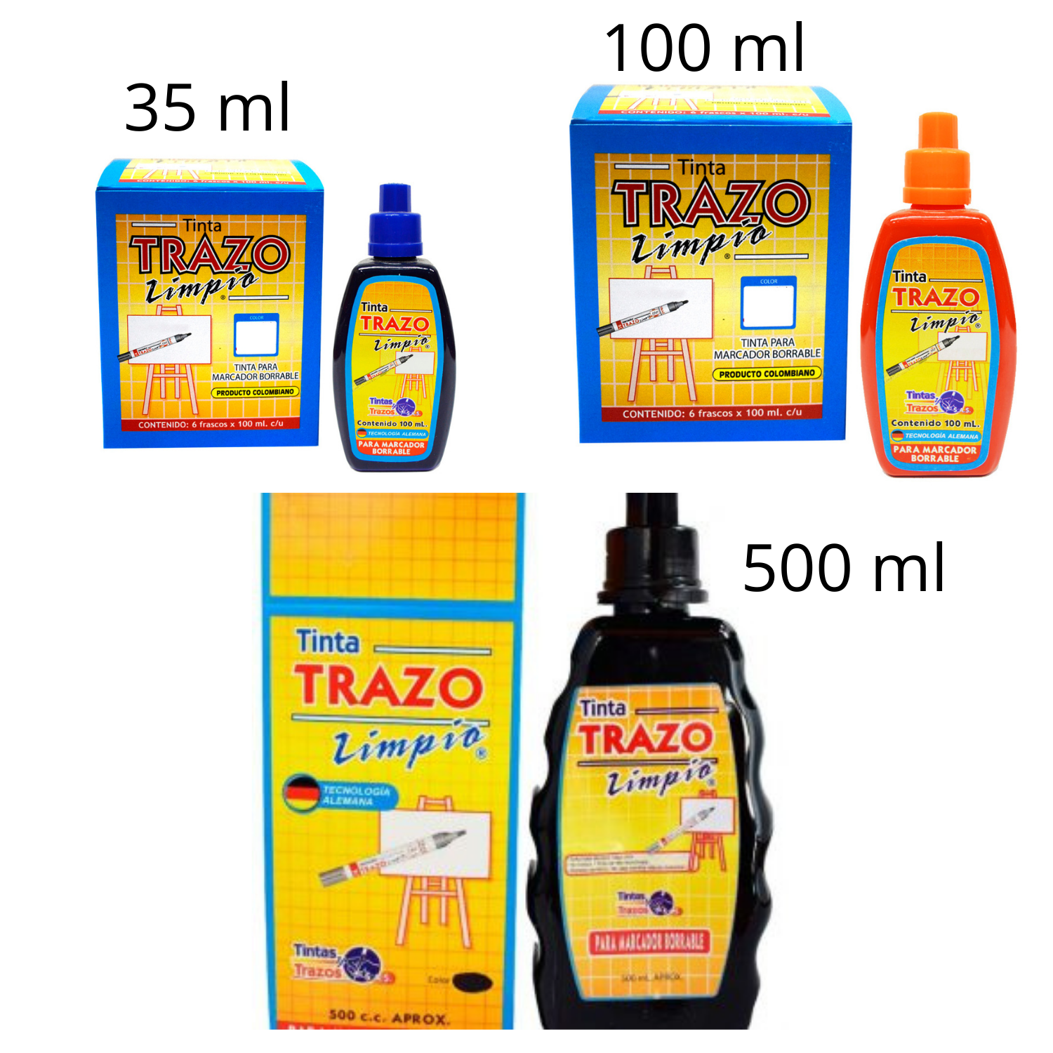 - 35 Mililitros: 9 colores diferentes Negro, Azul, Rojo, Café, Naranja, Morado, Verde Oscuro, Verde Limón, Fucsia más la opción de pedirlo surtido cuando es cantidad por 12